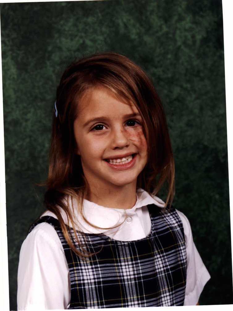 facial nevus after 9 surgeries using expanders, grafts, and laser--cute school picture of a first-grader!....with a few more touch-up surgeries to follow.