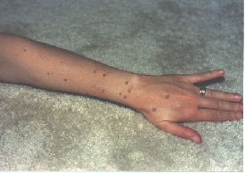 Satellites of arm. The bathing trunk nevus and the satellites were all coal black at birth and faded to cocoa brown by age 35. This person was born with 50 satellites and "popped out" hundreds more and now has well over 1000! Satellites are a higher risk characteristic. The more satellites, the higher the risk of complications. This person would be at higher risk for complications such as melanoma and NCM compared to a person without satellites. Even so, the risk for complications is low, about 9% overall for those with torso/bathing trunk nevi.