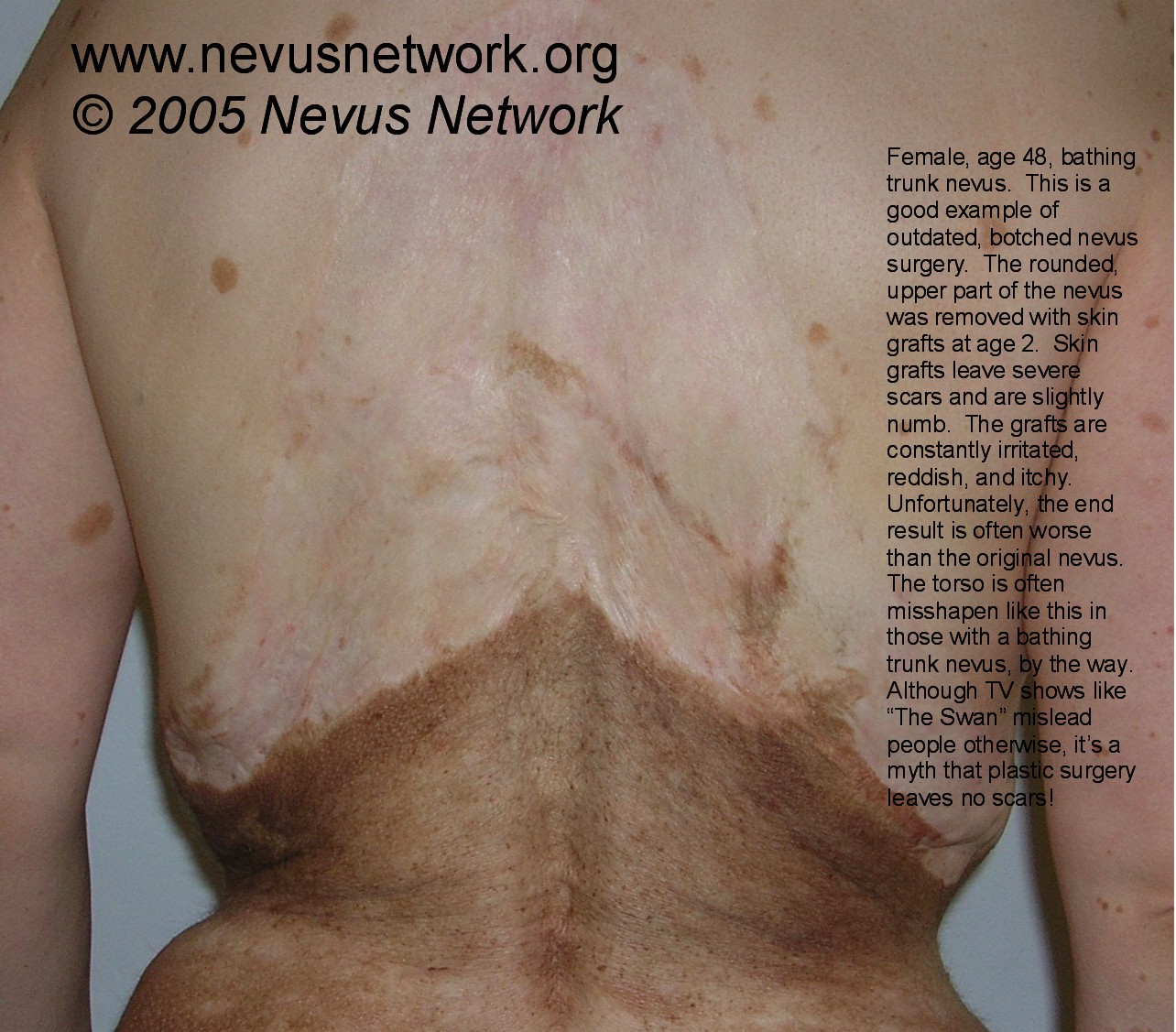 Another view showing dermabraded thighs and satellites of lower leg. The thighs were dermabraded 3 times at ages 1, 2, and 4. Each time the pigment seeped back. Dermabrasion left the thigh skin thin, fragile, and itchy. There are areas of thickened scar tissue called hypertrophied scars. Hair growth continues as dermabrasion only "sandpapers off" the top layer of skin and the hair follicles are located deeper in the skin. Dermabrasion bleeds heavily so this person needed 2 blood transfusions. Good thing the person did not catch AIDS or hepatitis or other as yet undiscovered blood-borne diseases from the transfusions! This is a good example of a person who is worse off after surgery than before, which unfortunately, happens often in nevus surgery.